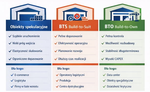 Dobór właściwego modelu realizacji obiektu magazynowego powinien wynikać z profilu operacji, horyzontu czasowego najmu oraz poziomu wymagań technicznych i technologicznych. W praktyce firmy najczęściej wybierają pomiędzy obiektami spekulacyjnymi, BTS lub BTO, równoważąc szybkość uruchomienia działalności, koszty adaptacji oraz elastyczność rozwoju w kolejnych latach.
